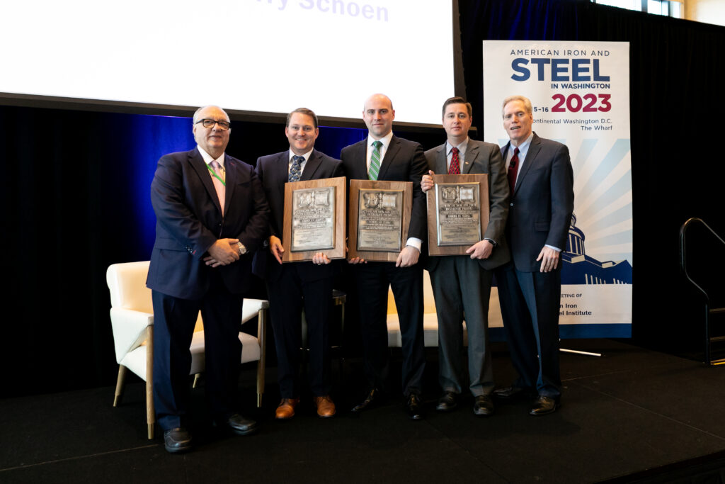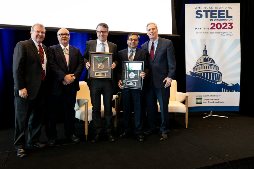 May 19, 2023Washington, D.C. – On Tuesday, the American Iron and Steel Institute (AISI) presented its highest technical award – the 2023 Institute Medal – to Garrett Angus, Jerry Schoen, Chris Jones and Grant Thomas of Cleveland-Cliffs, Inc., for their paper: “Si-Cr-Al-Mn Alloys for High Specific Resistivity and Application to Grain Oriented and Non-Grain-Oriented Electrical Steels.” The award was presented by Lourenco Goncalves, AISI chairman and chairman, president and CEO of Cleveland-Cliffs, during AISI’s 2023 General Meeting in Washington, D.C.