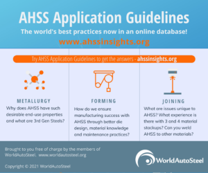 Advanced High-Strength Steel Guidelines – The leading source for technical best practices on the forming and joining of Advanced High-Strength Steels (AHSS) for vehicle manufacture is now available by WorldAutoSteel, the automotive group of the World Steel Association. The AHSS Application Guidelines Version 7.0 is now online at ahssinsights.org in a searchable database, allowing users to pinpoint information critical to successful use of these amazingly capable steels. WorldAutoSteel makes these Guidelines freely available for use to the world’s automotive community. Click here for a downloadable copy.